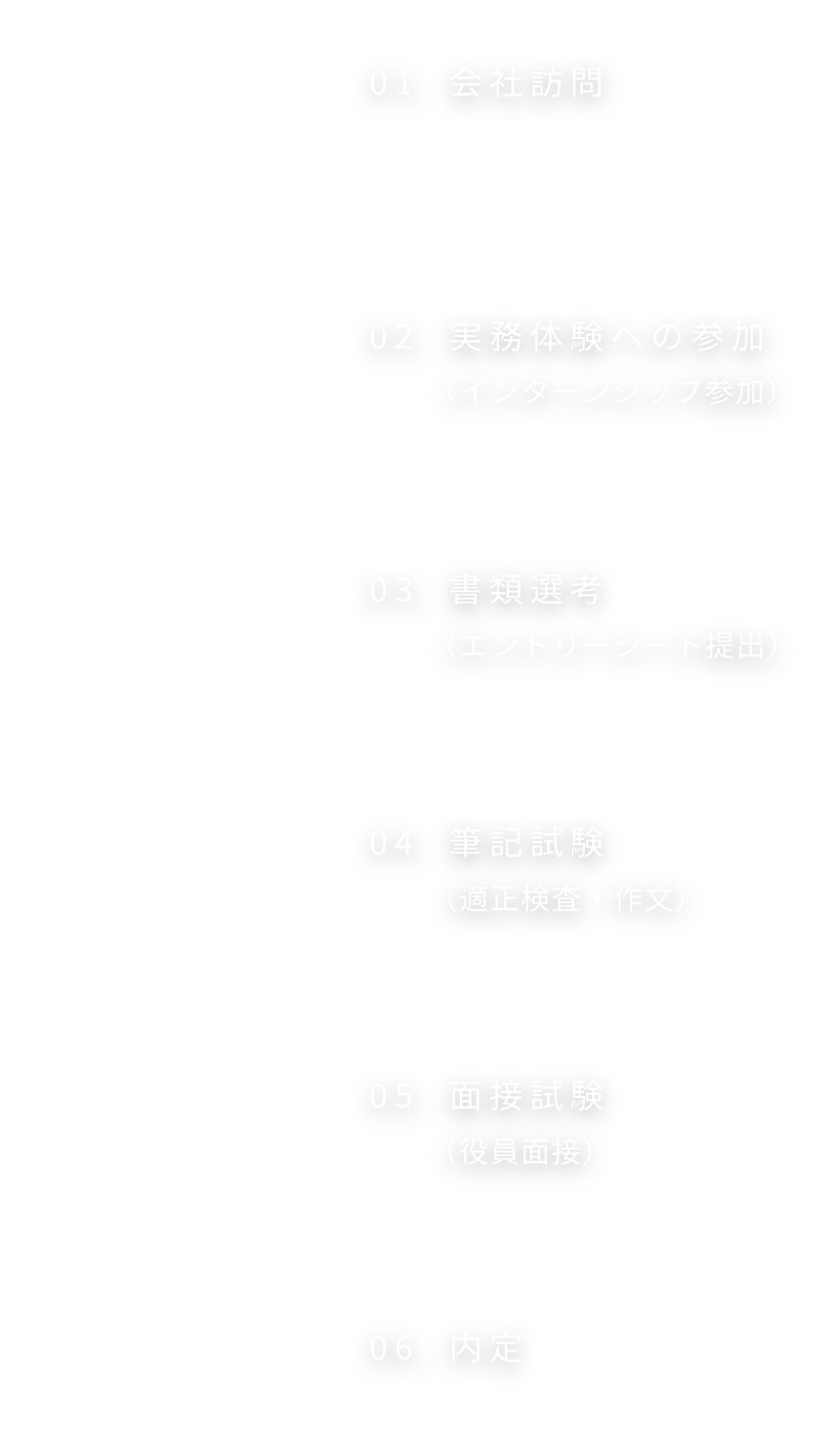 当社の特徴や社風を理解していただくため、入社希望者は3~5日のインターンシップ参加(現場体験)が必須となります。詳しくは、説明会にてお知らせいたしますので、まずは説明会へご参加ください。